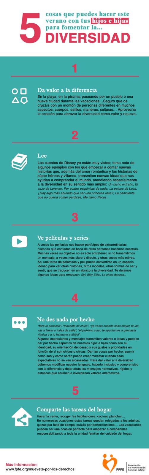 Una infografía de la Federación de Planificación Familiar Estatal, de la que soy orgullosa socia. Me parece fundamental educar a nuestr@s hij@s en la diversidad, promover un lenguaje inclusivo, dar valor a la diferencia y celebrarla… Si estáis de acuerdo conmigo, éstas ideas me han parecido útiles y merecedoras de difusión. ¡Un abrazo a tod@s y cada un@!!